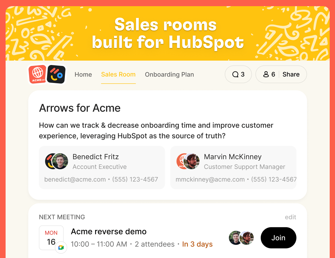 We'll also be exploring Arrows new AI-powered sales rooms, which connect natively to your sales deals in HubSpot to help reps give buyers everything they need to say yes, without having to spend time managing another tool or opening a new tab.