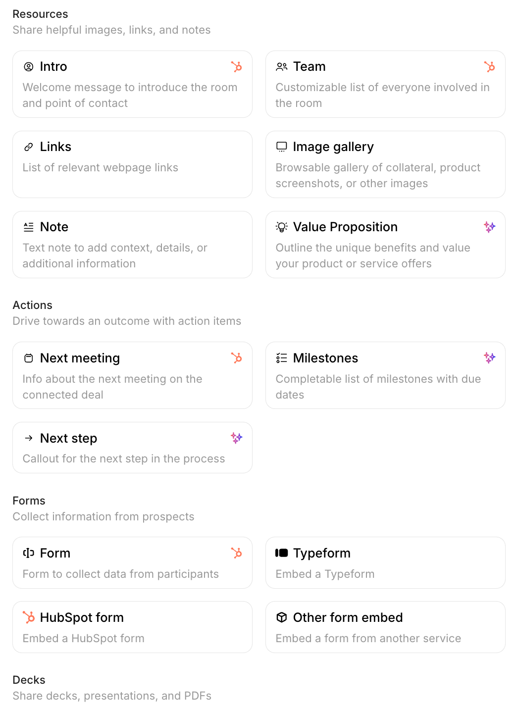 📚 Beyond creating specific templates as a starting point for each room, you can also add content to your block library making it easy to add to an individual room as needed to move a deal forward.💡 Before you begin, ensure your call recording tool is properly integrated with HubSpot. The quality of meeting summaries synced to HubSpot significantly impacts the AI suggestions you'll receive.