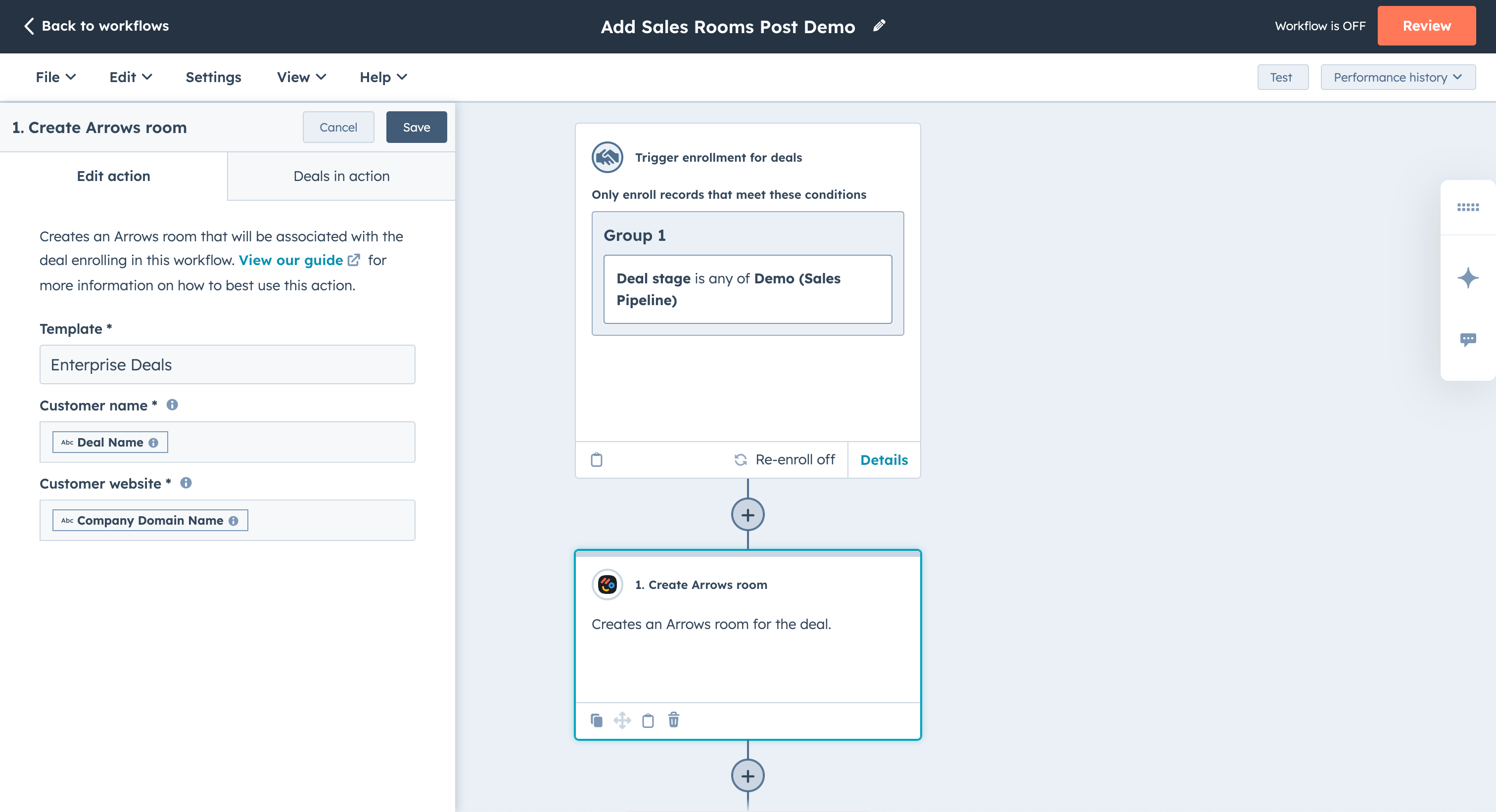 Step 2: Automated Arrows sales room creation in a HubSpot workflow