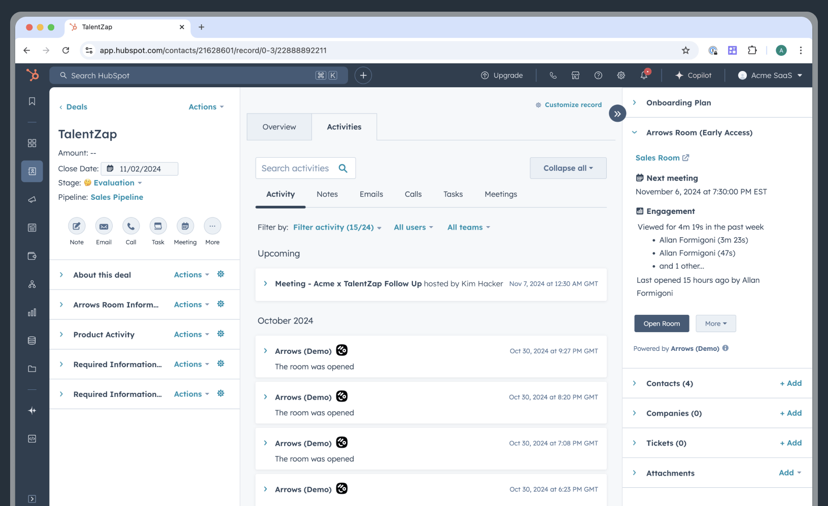 Native HubSpot Integration Sales tools that live outside your CRM create friction and get abandoned. Arrows lives where your team already works: → Create and manage rooms directly from HubSpot deals → Automate room creation with HubSpot workflows → Track engagement in deal activity timelines → Build reports on room performance using synced HubSpot properties→ Connect the customer experience to HubSpot across the full customer journey with Arrows onboarding plans and customer portals