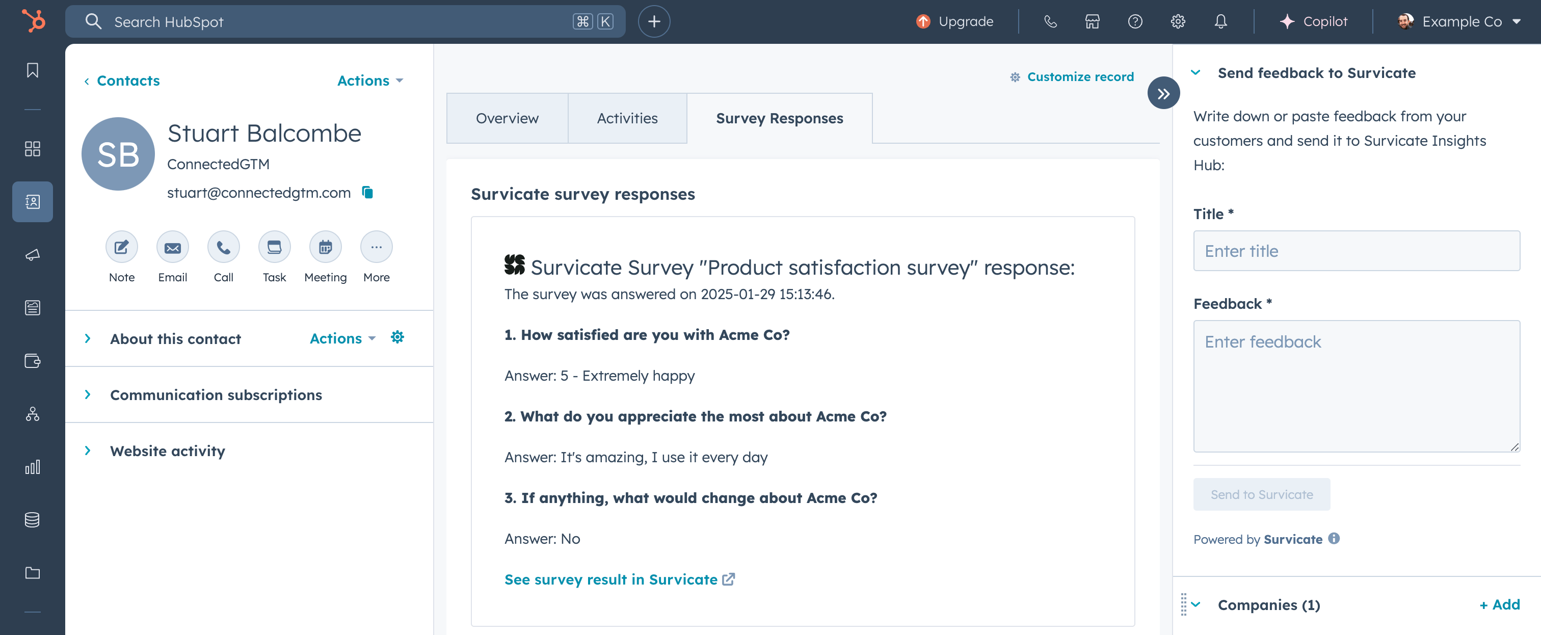 Survey responses automatically appear in the center panel of HubSpot contact, company, and deal records, making customer feedback instantly accessible to all teams.