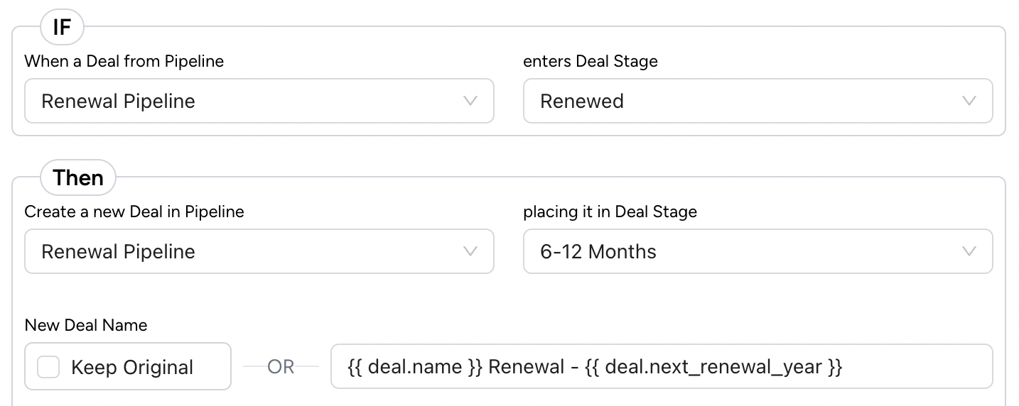 Option 2: Automated 🤖4. From either the CloneNer CRM card on a deal or the settings page click actions and then “Auto Rules”💡 Auto Rules are mini workflows specifically for duplicating HubSpot records.5. Create a new auto rule called “Create Subsequent Renewal Deals” → IF a deal from the “Renewal Pipeline” enters Deal Stage “Renewed” → THEN create a new deal in the “Renewal Pipeline” placing it in the 6-12 months stage.6. Update your critical deal details, instead of changing values manually we can use {{ }} syntax to include dynamic property values. eg. → Deal Name: {{ company name }} - Renewal {{ next renewal year }}7. Select your deal associations to also be duplicated to the new deal. At a minimum, I would suggest Contacts, Companies, and Line Items.