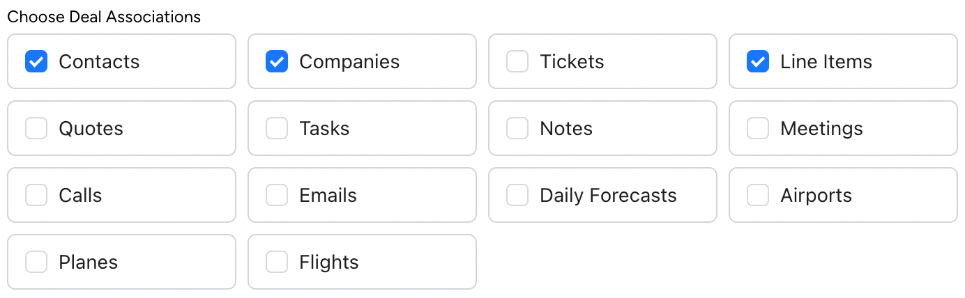 Select associations you wish to preserve in the new record across available HubSpot objects.
