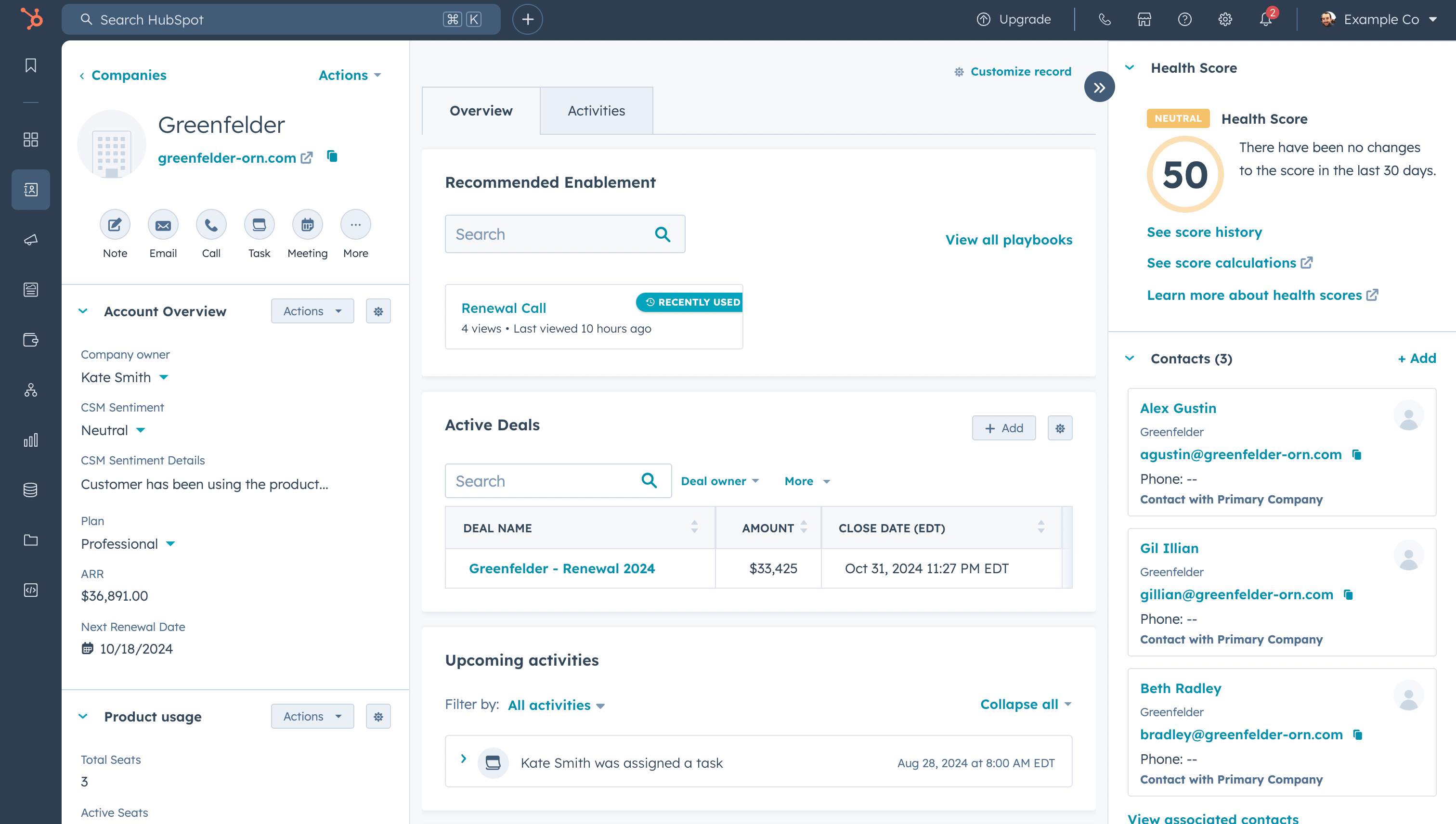 → Company Name → Next Renewal Date → ARR → Health Status → Usage Trend (synced from your product) → Total Seats (synced from your product) → Active Seats (synced from your product) → Last Activity Date → Company Owner