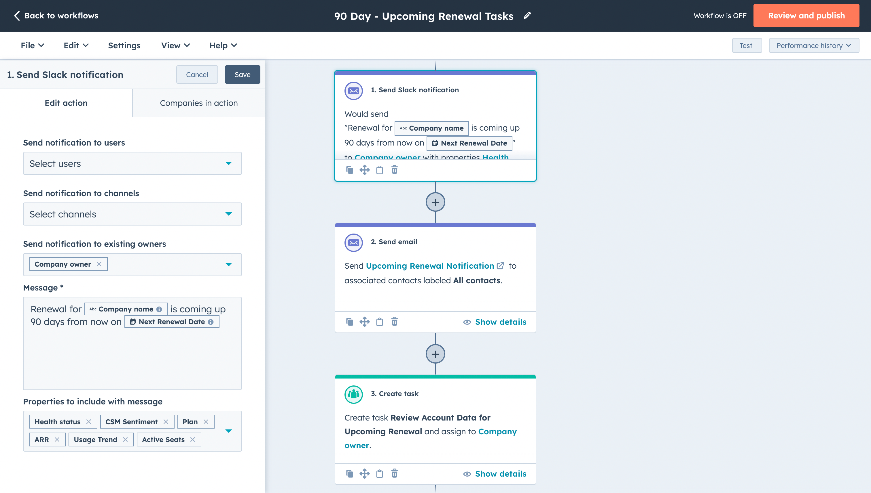 2. 🔔 Send a Slack notification → Send to existing company owners→ Message: “Renewal for. { Company Name } is coming up 90 days from now on { Next Renewal Date } → Properties to include: Health Status, CSM Sentiment, Plan, ARR, Usage Trend, Active Seats