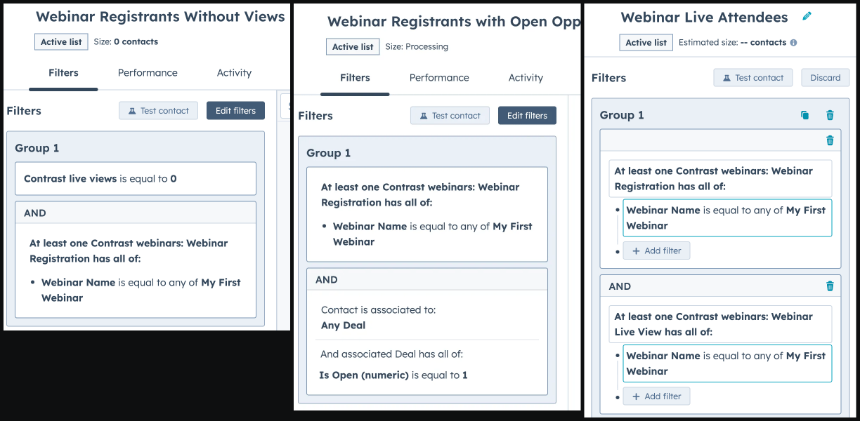 While other webinar options require manual CSV imports or complex Zapier workflows to sync with HubSpot, Contrast provides a deep integration that enables: