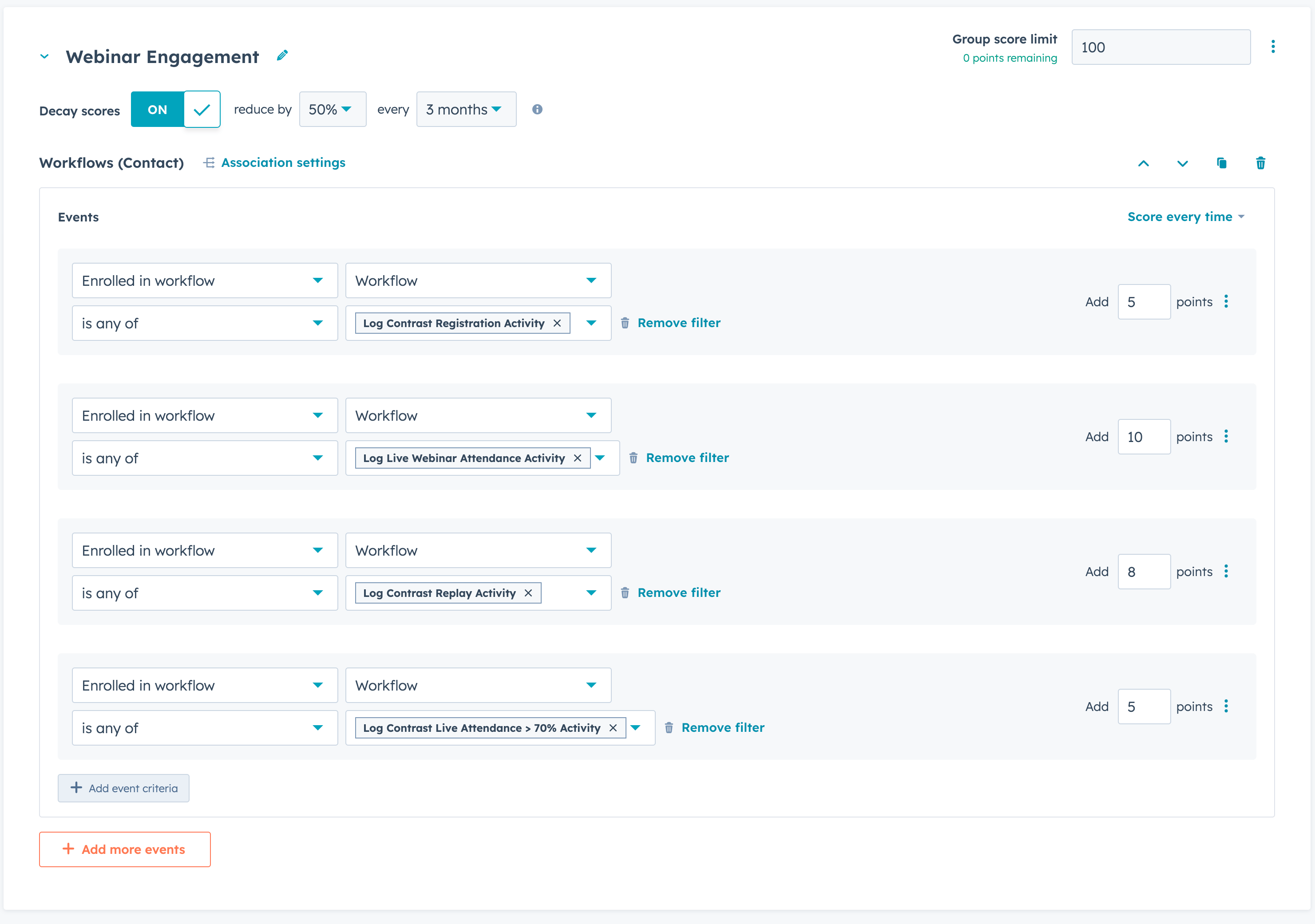 To build an effective scoring model using Contrast's webinar engagement data in HubSpot you’ll need to create workflows for each webinar engagement criteria you would like to include in your lead score.