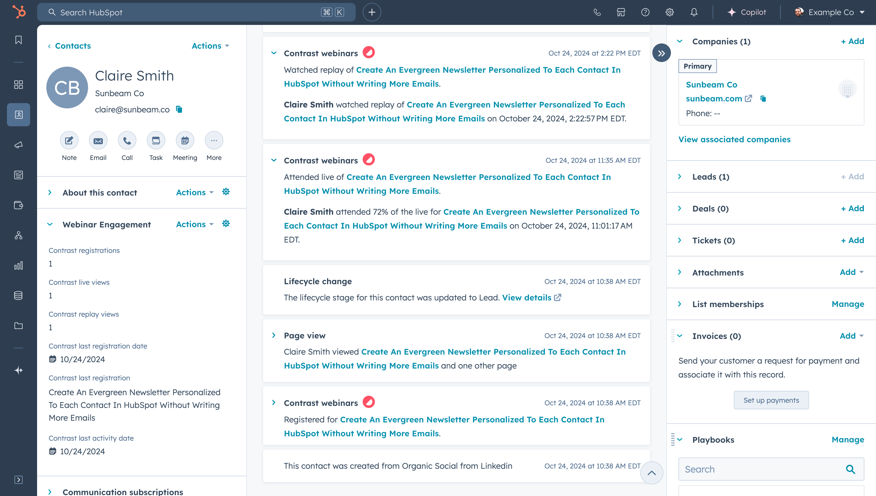 Most teams waste hours manually updating CRM records after webinars, leading to data gaps and missed follow-up opportunities. Contrast pushes 20+ engagement datapoints to HubSpot in real-time: