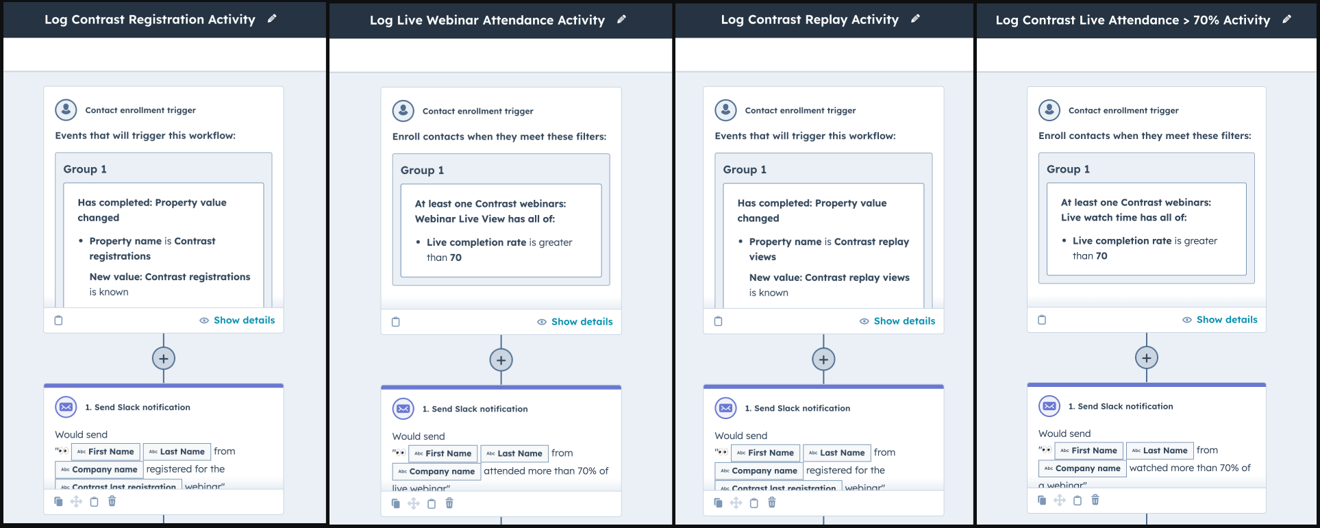 🤖 Action 1: Send Slack notification→ Channel: #sales→ Message: 💻 {{ contact.firstname }} {{ contact.lastname }} from {{ company.name }} attended more than 70% of the {{ contact.contrast_last_registration }} webinar.
