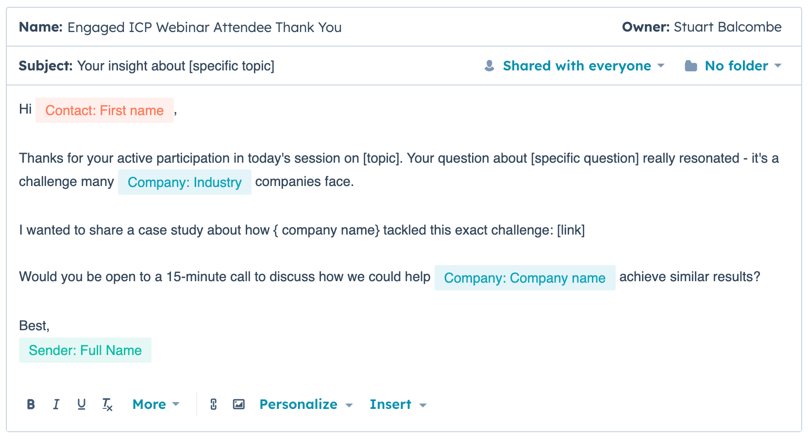 🔀 Action 2: Enroll in sequence (HubSpot enterprise tiers only)→ Name: Engaged ICP Webinar Follow Up→ Sender Type: Contact owner→ Contact Owner: Contact owner