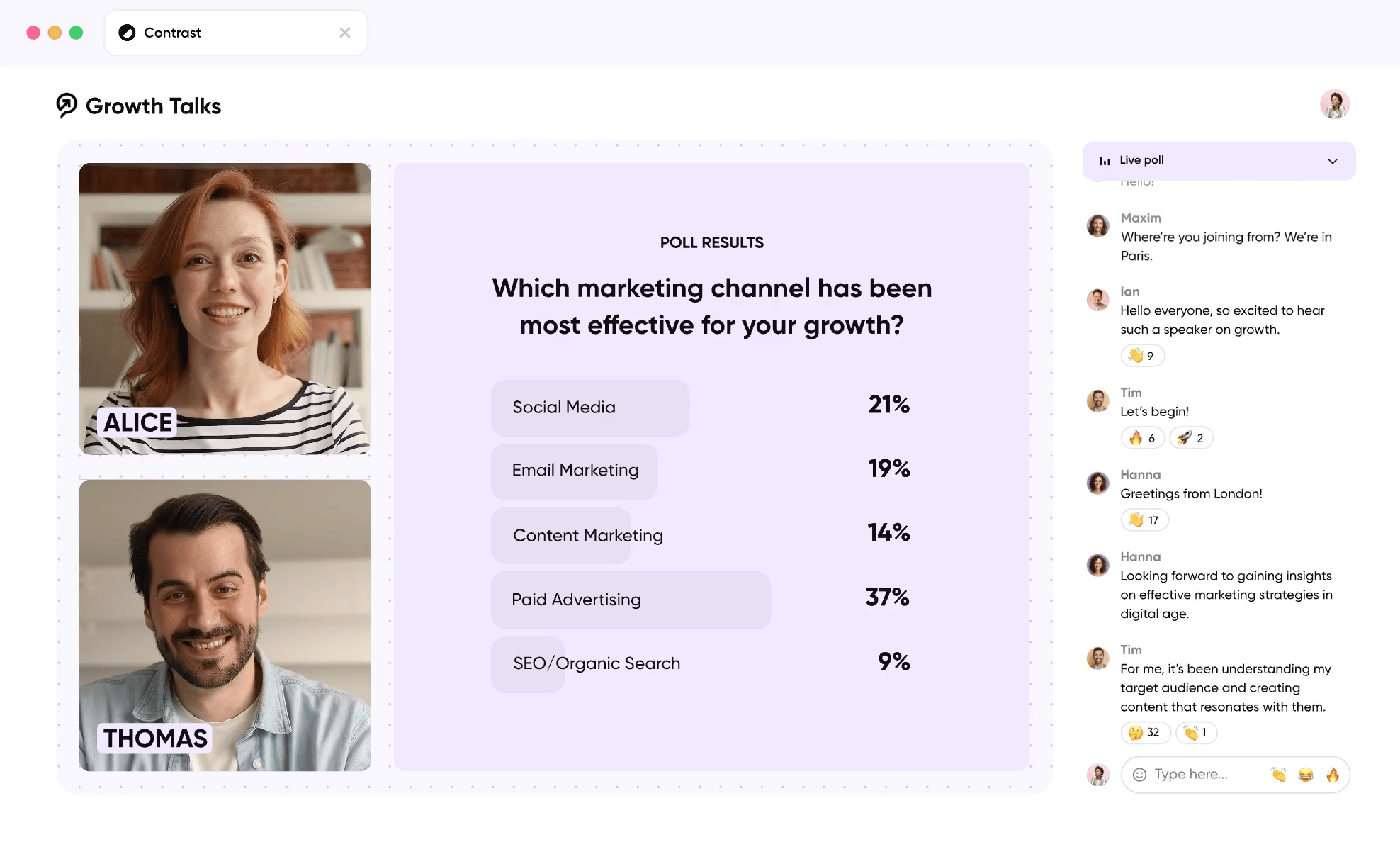 Generic webinar platforms make your brand look outdated and unprofessional, hurting credibility with prospects. Contrast provides complete brand control: → Use your own colors, fonts, and logos → Add interactive chat, audience polls, and Q&A → Automate and customize pre and post webinar emails