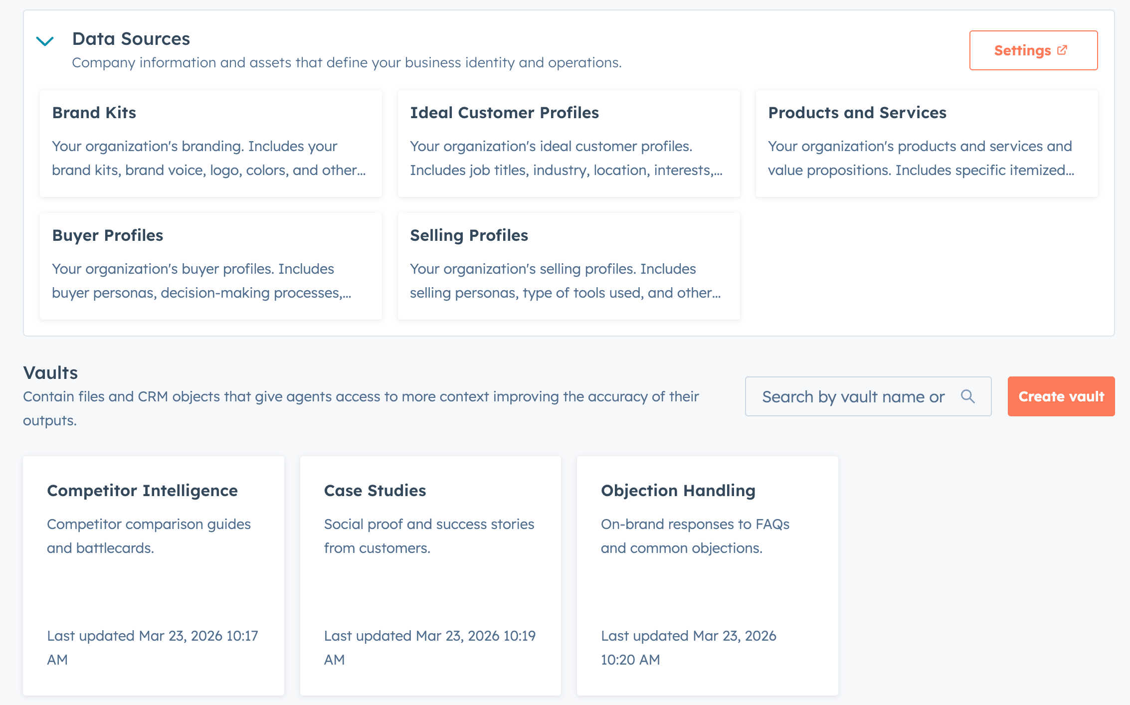 That context is stored inside the HubSpot settings for Data Sources and Knowledge Vaults.