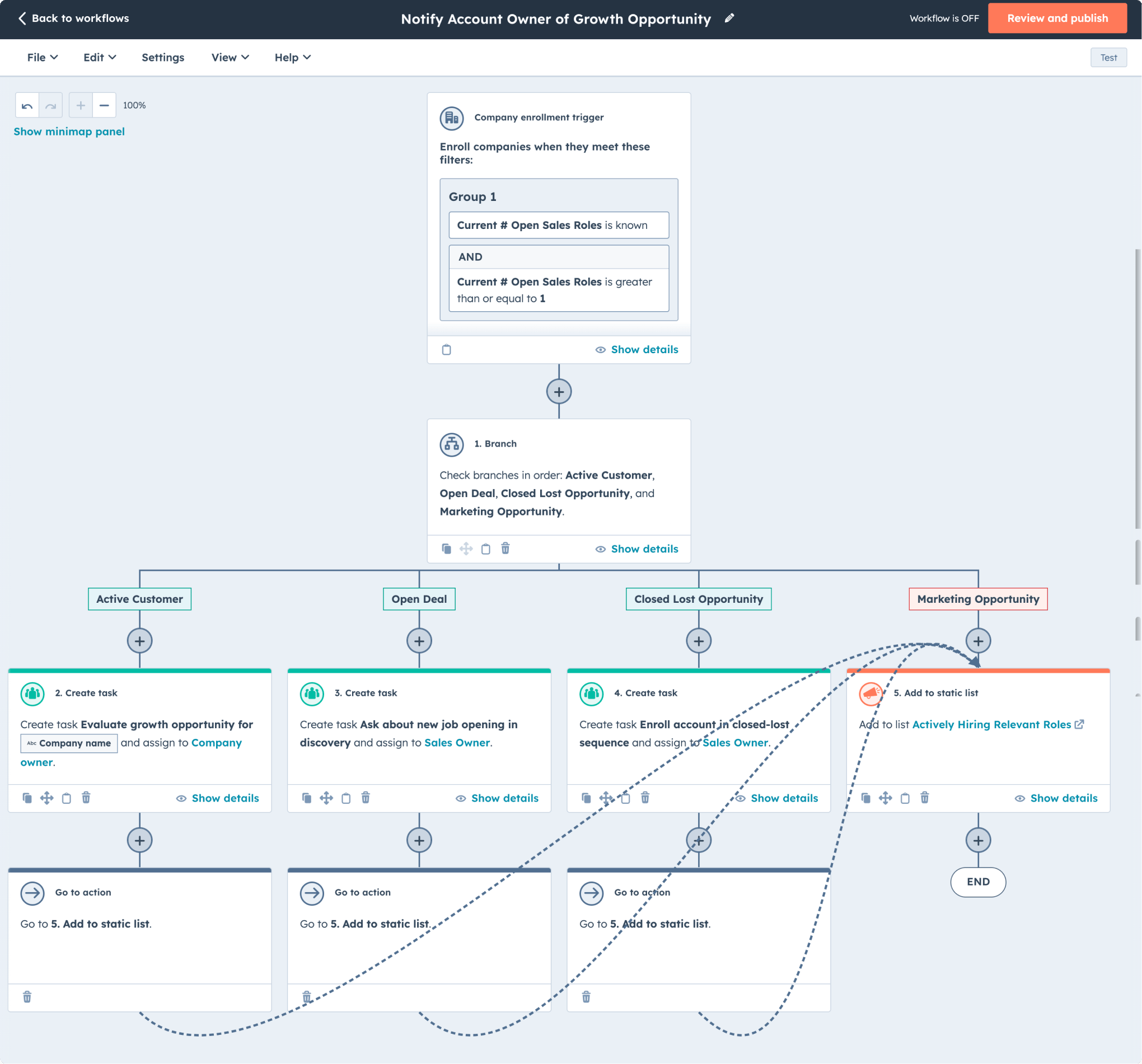 1. Create a company-based workflow⚡️ Trigger Criteria: Property value changed → Current # Open Sales Roles is known → AND Current # Open Sales Roles is greater than or equal to 12. 🌴 Branch: Active Customer, Open Deal, Closed Lost Opportunity, and Marketing Opportunity.→ Active Customer: Lifecycle stage is any of Opportunity or Customer→ Open Deal: Lifecycle stage is any of Opportunity→ Closed Lost Opportunity: Company is associated to: Any Deal And associated Deal has all of: Deal stage is any of Closed Lost (Sales Pipeline)3. ✅ For each branch create an appropriate next step task → Active Customer: Evaluate growth opportunity for “Company Name” and assign to company owner→ Open Deal: Ask about new job opening in discovery and assign to sales owner→ Closed Lost Opportunity: Enroll account in closed-lost sequence and assign to sales owner4. 📋 Add the enrolled company to a static list “Actively Hiring Relevant Roles”→ Use this list to build contact lists, enroll in sequences etc