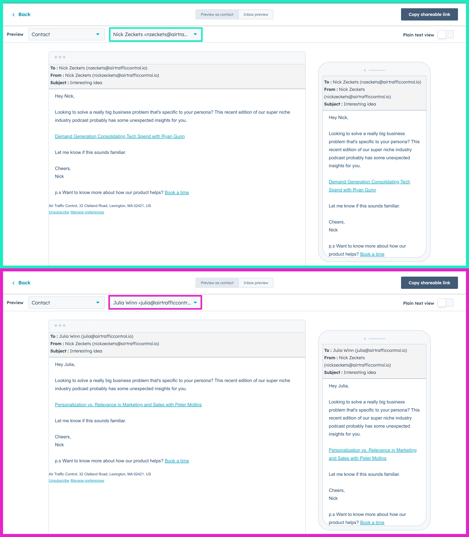 Because Air Traffic Control adds personalized content recommendations for each contact to HubSpot properties you can send one email template and every contact will receive the content that’s most likely to resonate with them.