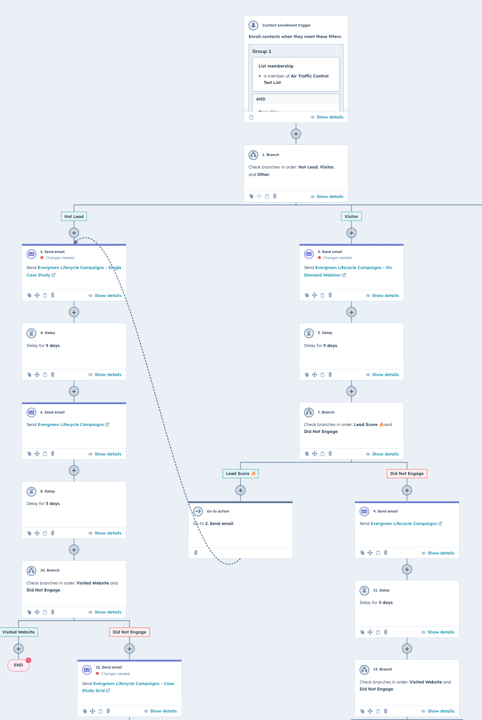 To manage the experience for each contact at a target account we can build an automated workflow to branch the communication and the subsequent experience they receive based on the way they are engaging with our campaign.
