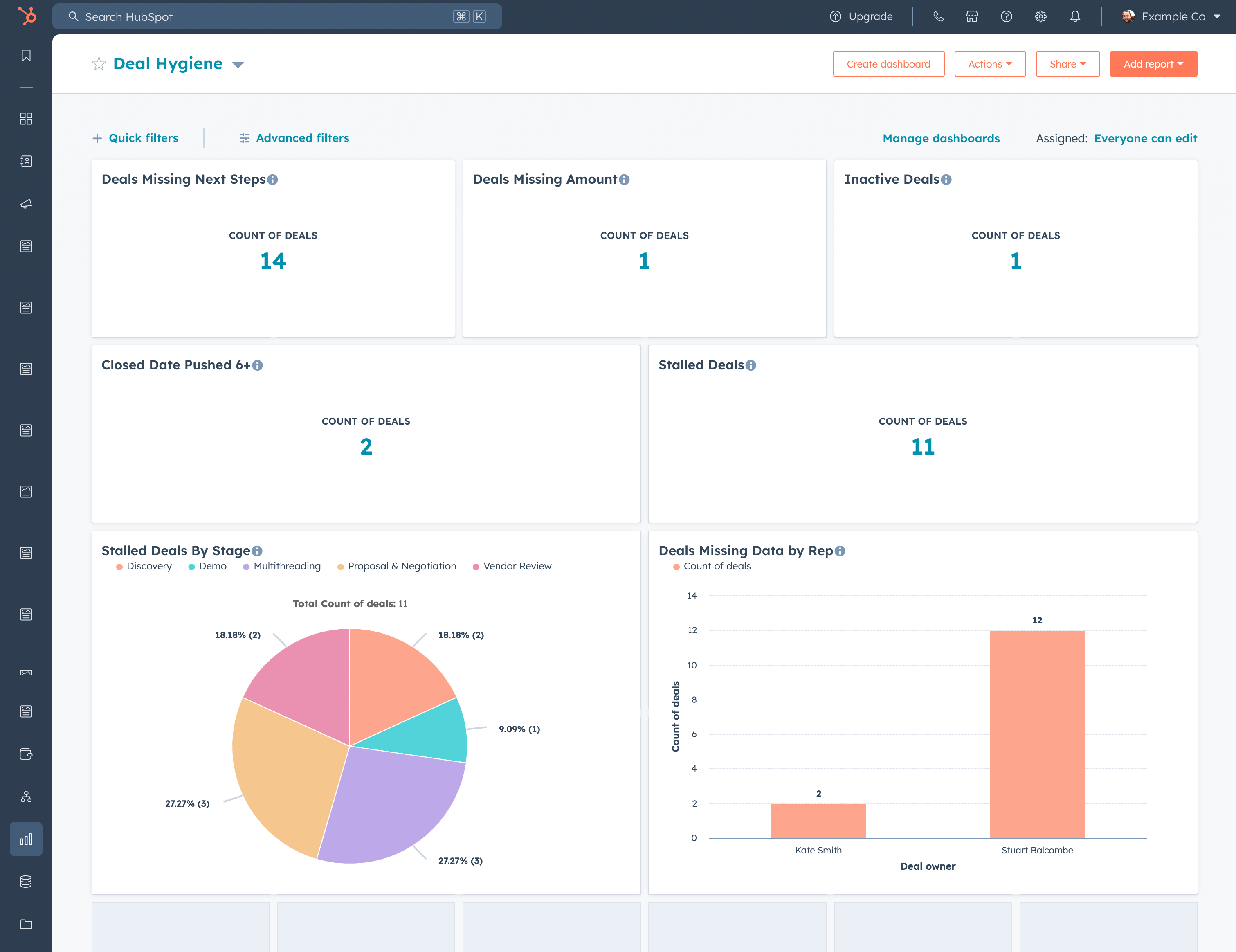 Dashboard to identify deals with missing data→ Report #1 - Deals Missing Next Steps→ Report #2 - Deals Missing Amounts→ Report #3 - Deals Missing Next Steps→ Report #4: Deals getting pushed→ Report #5: Stalled Deals→ Report #6: Stalled Deals by Stage→ Report #7 - Deals Missing Data by Rep